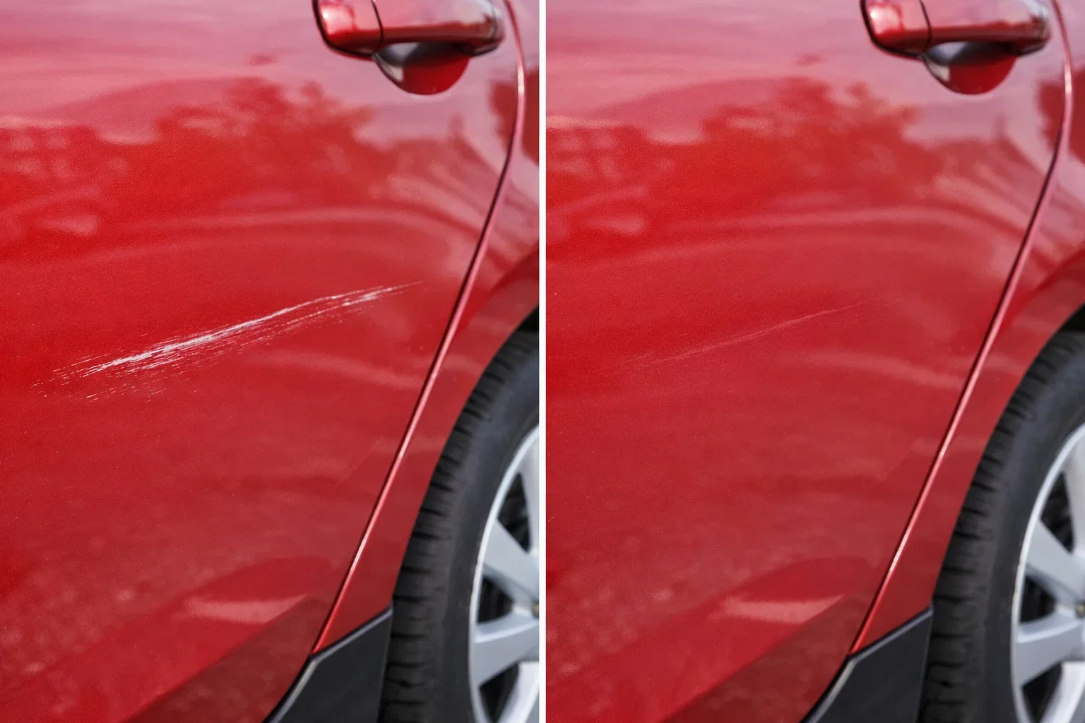 Wir haben bewusst verschiedene Kratzertypen getestet: feine Haarlinien, tiefere Parkplatzkratzer und einen längeren Schlüsselkratzer der optisch am schlimmsten aussah.